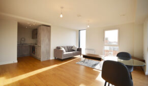 🛏️ BEDROOM: The first flat includes a spacious and neutral bedroom with a double bed, bedside table, mirrored wardrobe, desk and chair, as well as a large window for a bright and airy feel.
