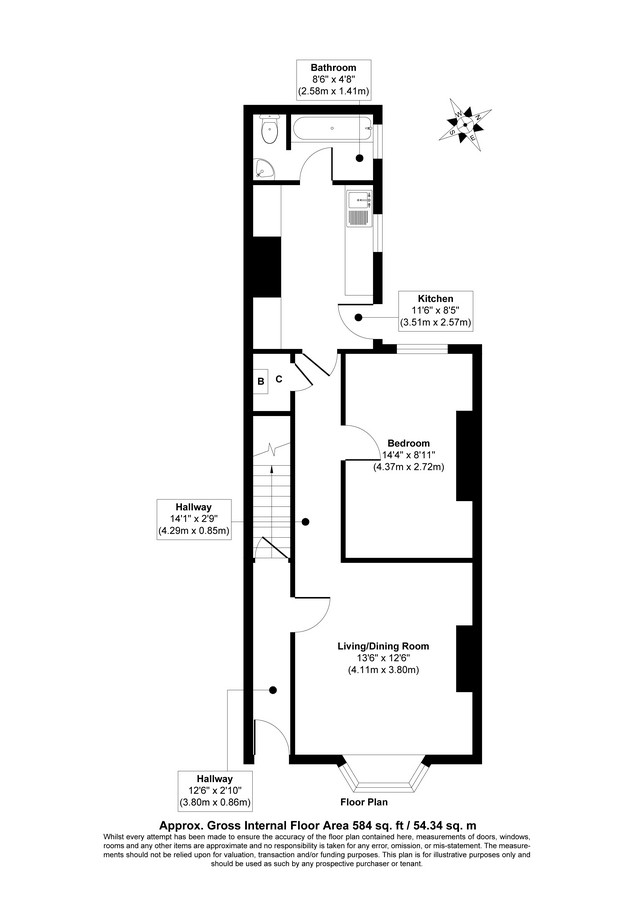 🛁 BATHROOM – Decorated with black tiling, the bathroom features a white three piece suite including a wash basin, W.C., and a shower/bath combination in its own section. An extractor fan and large window provide ventilation.